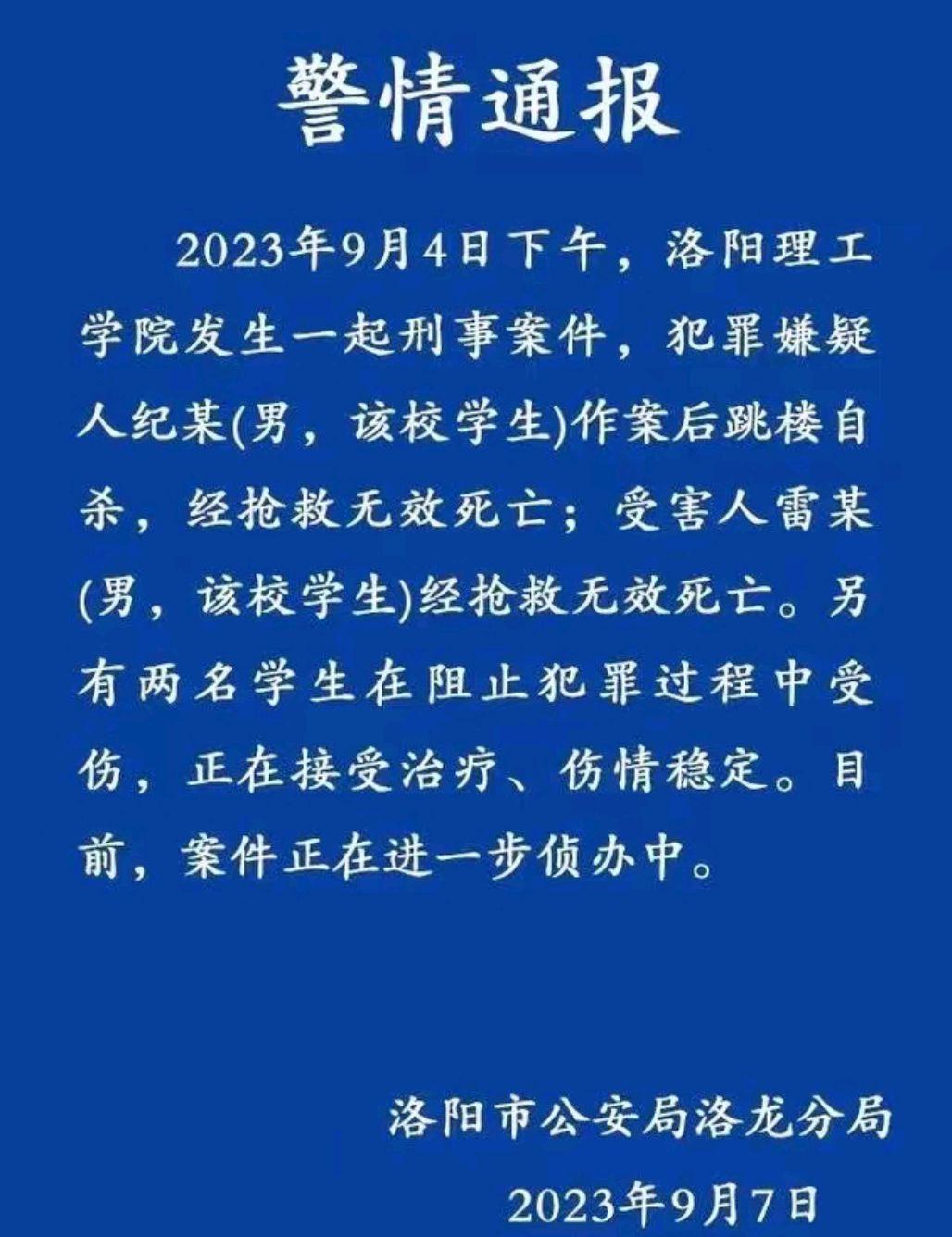 九月是开学季。然而,开学还没几天,河南省洛阳理工学院就发生一起惨剧。一个叫纪某的大四学生,把同寝室同班的学生雷某刺死,同时把两名劝阻的学生刺伤,之后跳楼自杀。