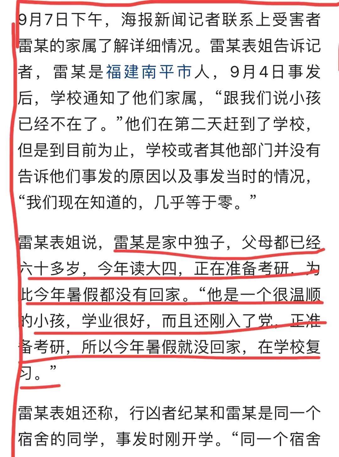 据有知情人士透露,遇难者雷某是班上班干部,在上学期的一次考试中,雷某泄露了考试题,全班很多同学因此取得了佳绩,但不知为什么,纪某没有抄到题,挂科了,于是怀恨在心,认为雷某是针对自己。