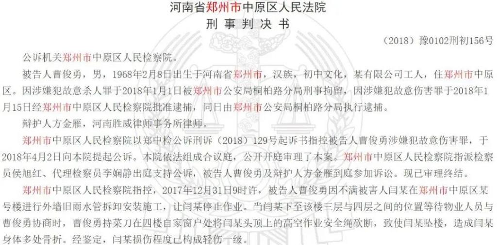 2017 年 12 月 31 日 9 时许,被告人曹某某因不满被害人闫某在郑州市中原区某号楼进行外墙旧水管拆卸安装施工,让闫某停止作业。在闫某下至该楼三层与四层之间的位置等待物业人员前来与曹某某协商时,曹某某持菜刀在四楼自家卫生间窗户处将闫某头顶上的高空作业安全绳砍断,致使闫某坠楼,造成闫某身体多处骨折。