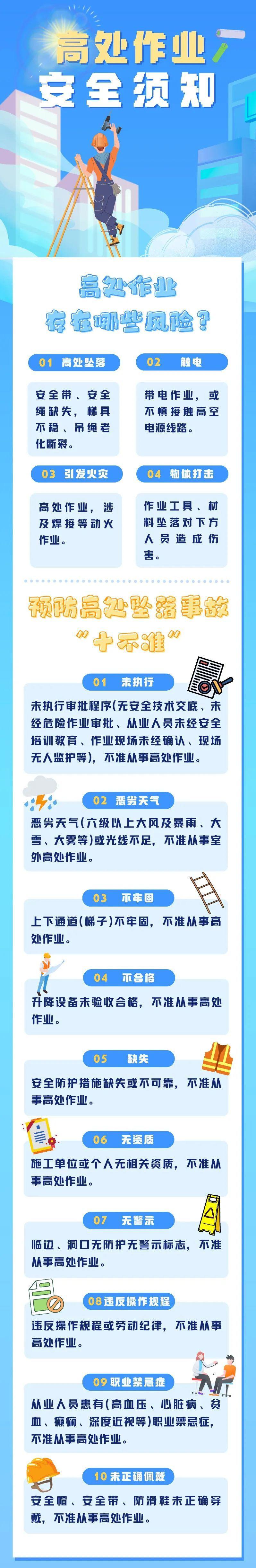 夏季高温炎热,高处作业时应遵守安全须知,确保防护装备完好有效并佩戴到位,作业时应及时补充水分,避免中暑、疲劳作业。这份安全提示请收好↓↓↓