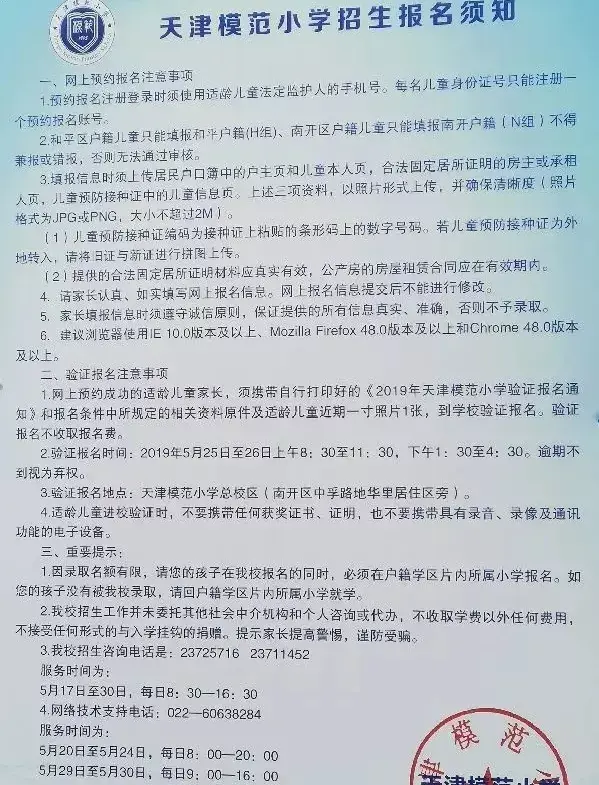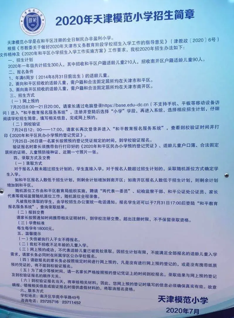 另外,从历年招生简章来看,2018年为“只招收南开区户籍或和平区户籍的适龄儿童”,2019年也提及了“和平区户籍儿童”、“南开区户籍儿童”,2020年为“招收南开区户籍和和平区户籍的适龄儿童”。由此看来,该校的招生条件还是比较严格的。