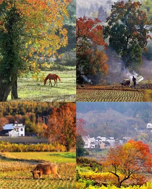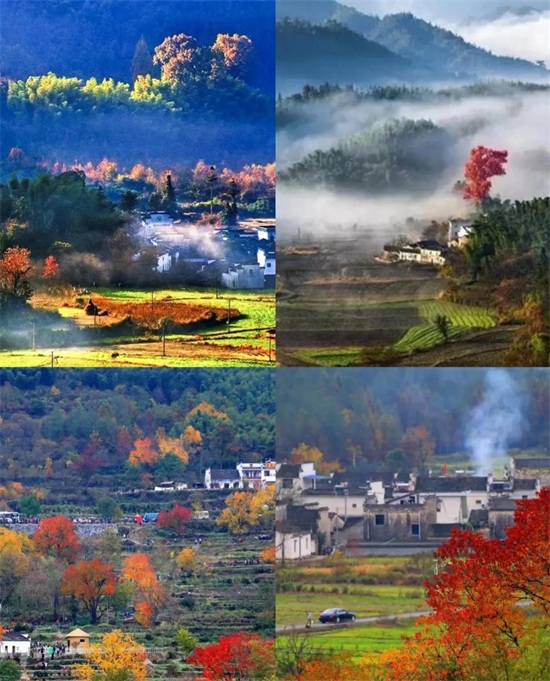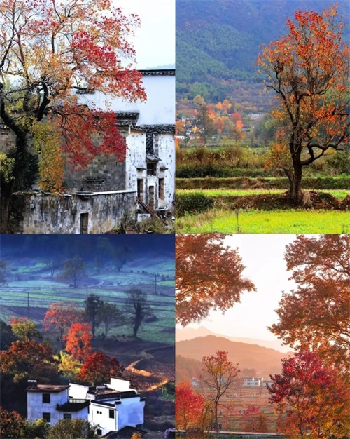 是秋季最美的景色之一,秋天乌桕树的叶子会变成红、黄等多种颜色,与粉墙黛瓦的古村落相互辉映,非常美丽