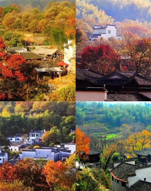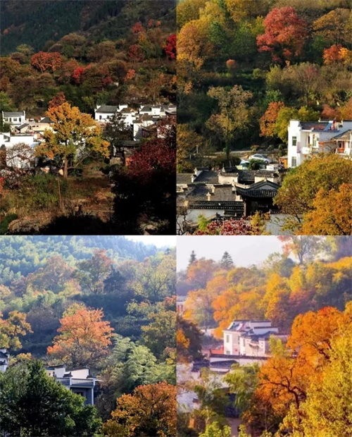 古村落保存完好,有着独特的徽派建筑风格。秋天里,古村落周围的树木会变成金黄色、红色等颜色,与古村落相互映衬,美不胜收