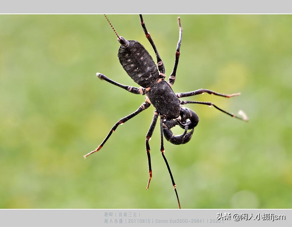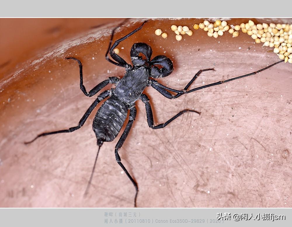 说真,这也是我们头一回遇见过的虫子,当时还真不知道它是什么。看着那对粗壮的螯肢,还有八只足,一根细长尾,我们只能判断,它不是昆虫(昆虫只有六足)。回来后在嘎嘎昆虫网中“按图索名”,查证得知是:鞭蝎。属于节肢动物门/鞭蝎目。