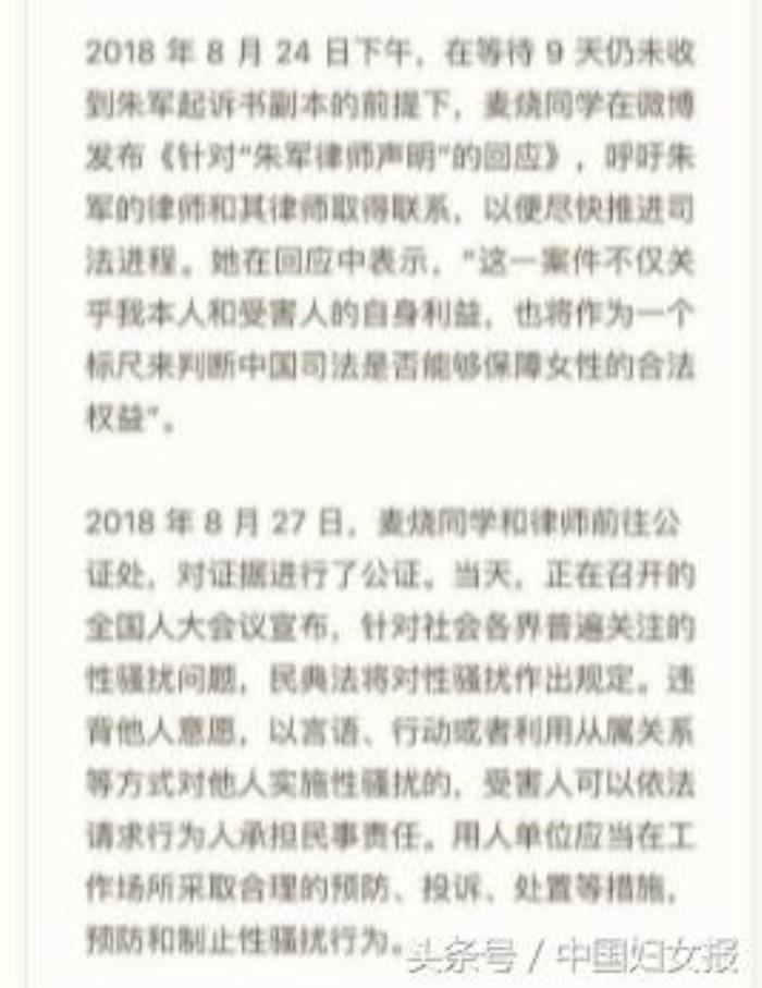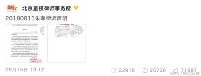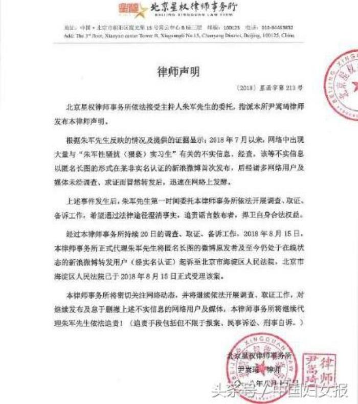8月15日,在经过“麦烧同学”爆料的20多天后,北京星权律师事务所受朱军委托发布律师声明,称近日来网络上出现大量“朱军性骚扰实习生”有关的不实信息,后经诸多网络用户及媒体不经调查、求证贸然转发,现已依法取证调查,将通过法律途径追责谣言散布者,捍卫自身合法权益。