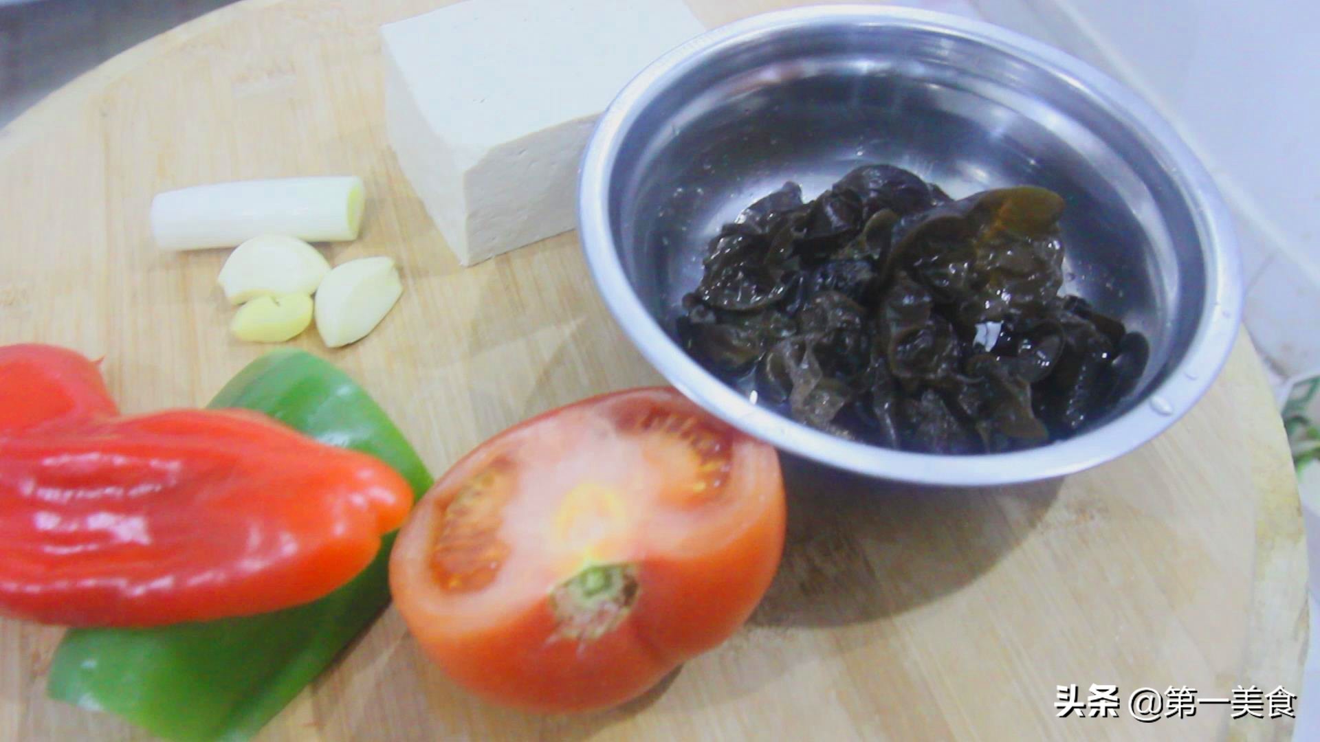 青椒、红椒切成菱形片,这样配色好看。西红柿半个,去蒂切成斜刀,木耳泡发后摘去根部,随便切上两刀,然后放在一起备用。