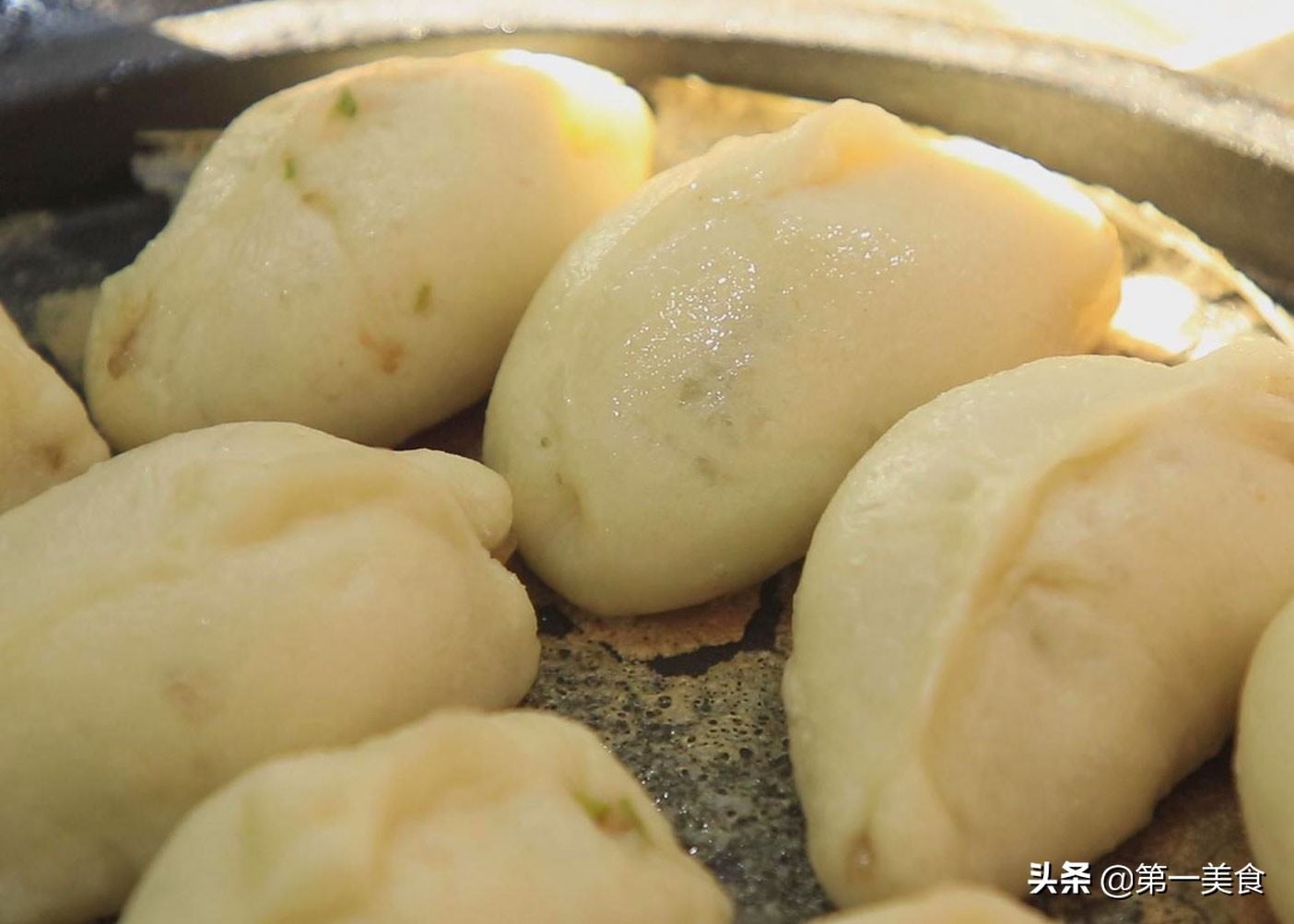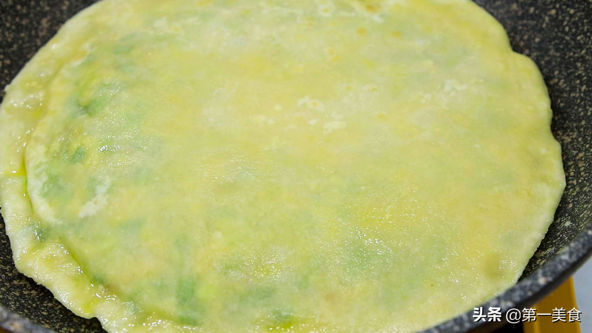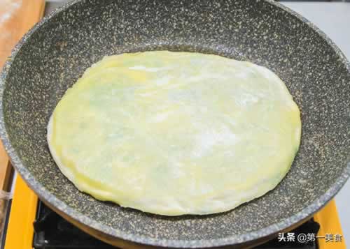 等到两面煎黄,皮熟的时候,里面的馅也就熟了。软软乎乎的菜馍就做好了,拿起来一卷就能吃。