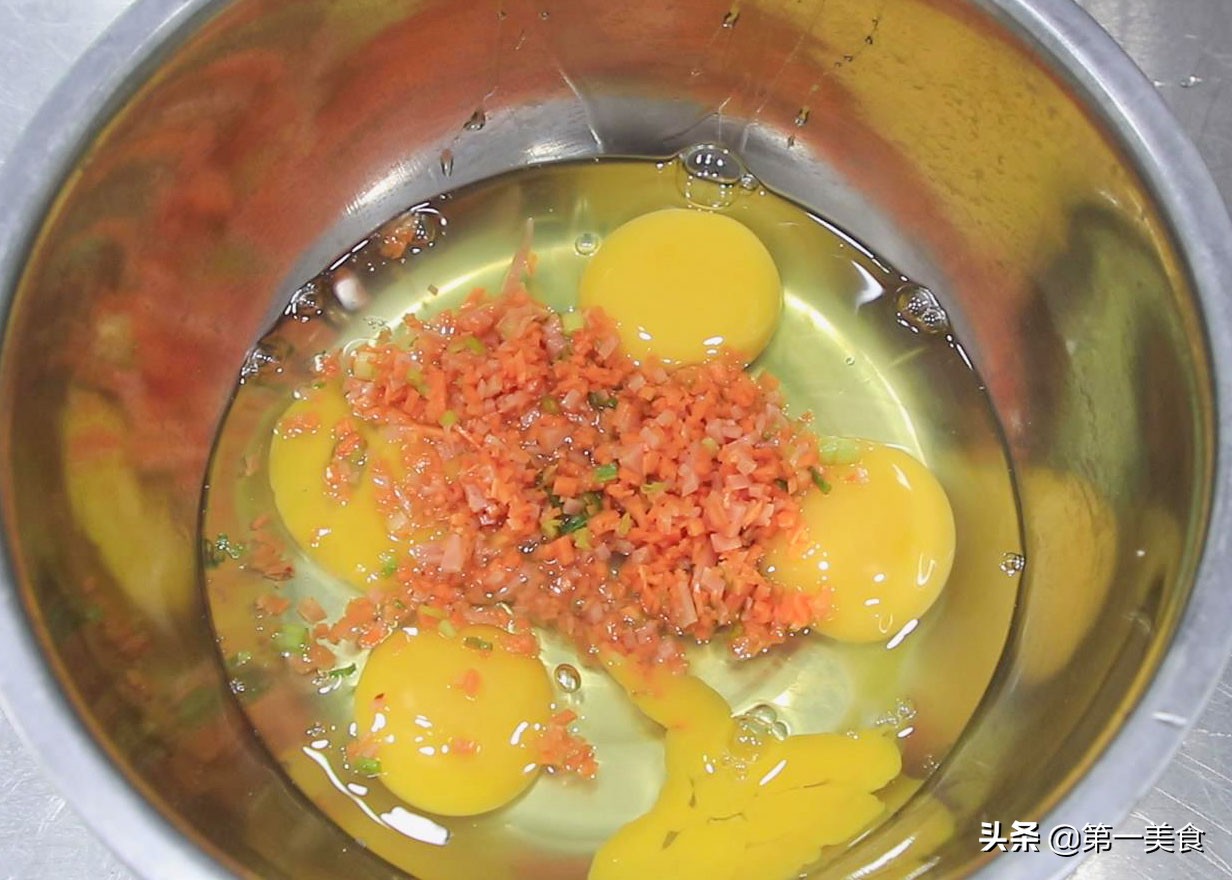 趁这个时间,切点香菜、胡萝卜粒。拿个小盆打几个鸡蛋放点盐,搅散。