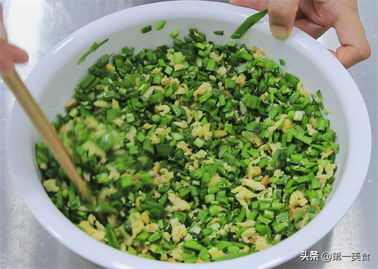 煎几个鸡蛋切碎,再切点韭菜碎,放在一起调味:倒点油、放点盐、喜欢吃五香粉的可以放点五香粉。