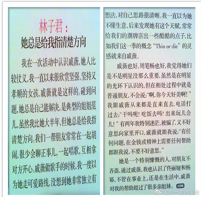 基于这些,林子君在采访的末尾总结道:“不管在事业上,还是生活中,戚薇对我的帮助超过了很多亲姐妹。”