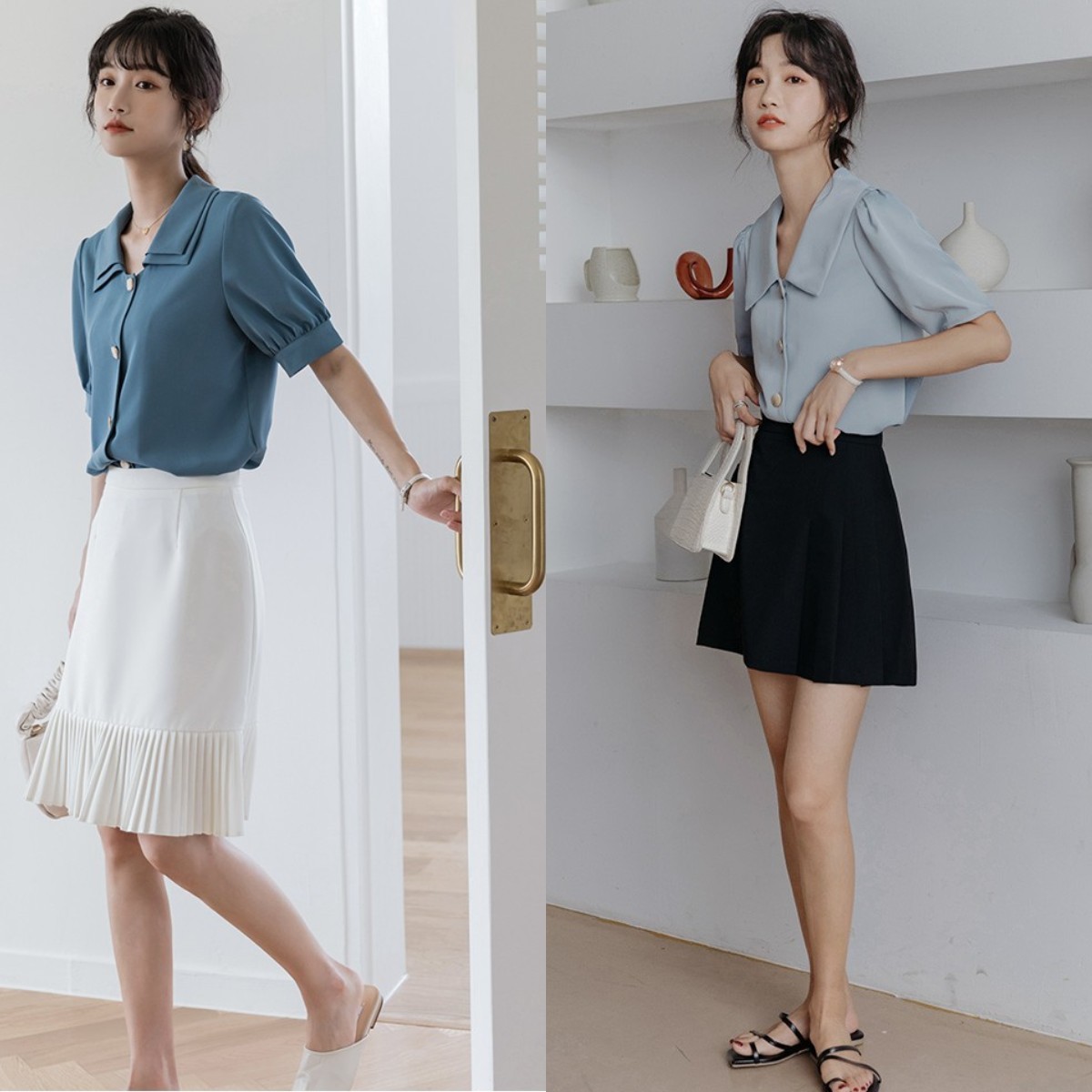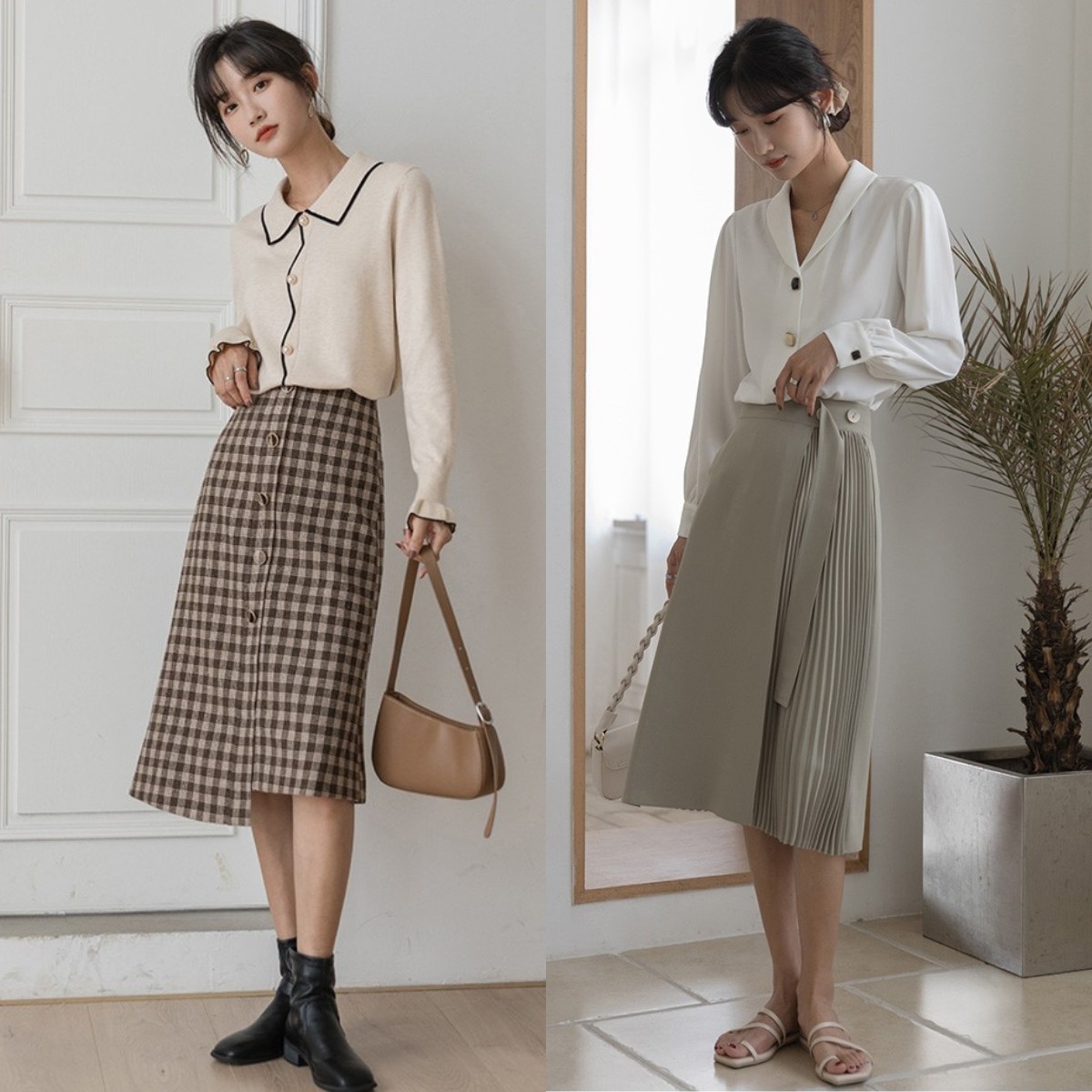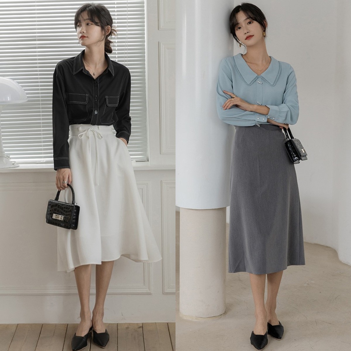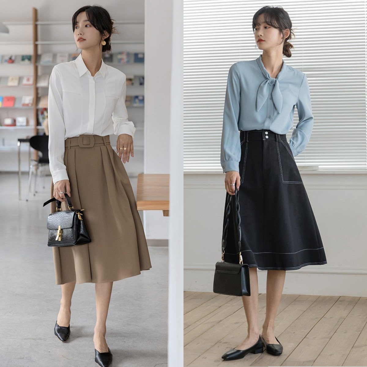 此外,如果是搭配高腰伞裙,那衬衫的版型就要尽量修身,不可选择材质、版型太过硬挺的款式,否则穿起来会很显臃肿,反而会压低个头!