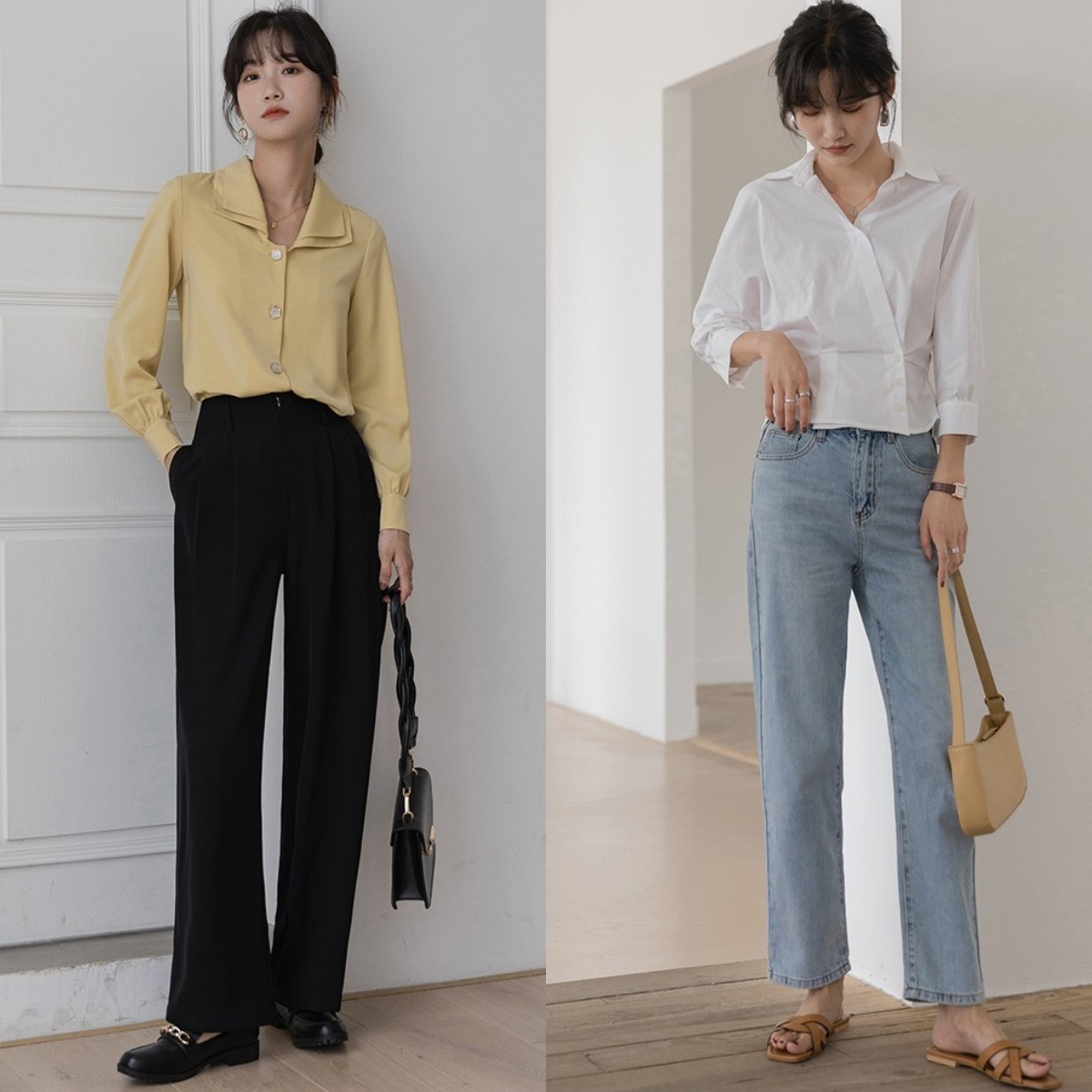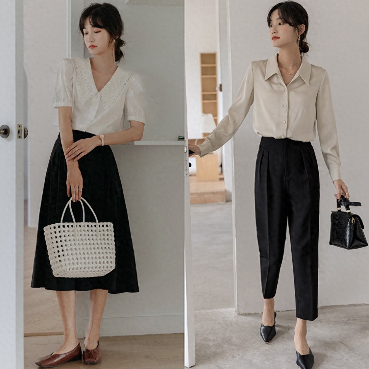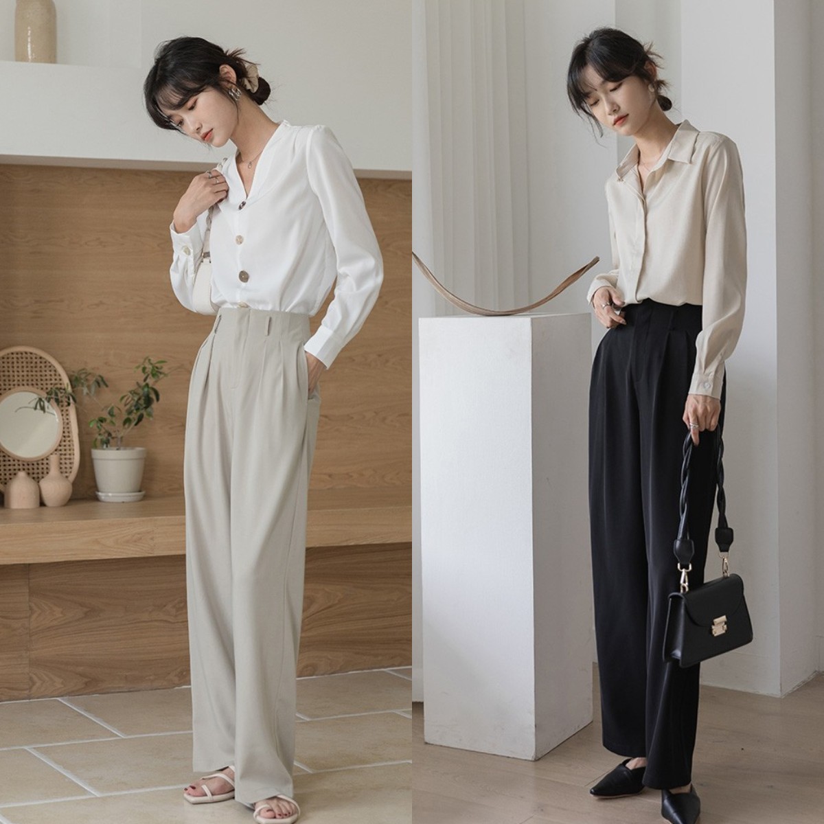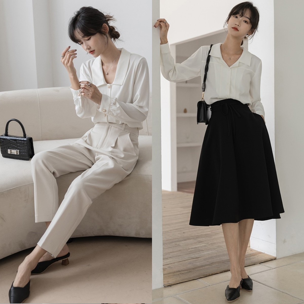 经过以上三点的讲解,下装已经非常好挑选了。衬衫+高腰阔腿裤的搭配,既提高腰线拉长腿部线条,又温柔知性。