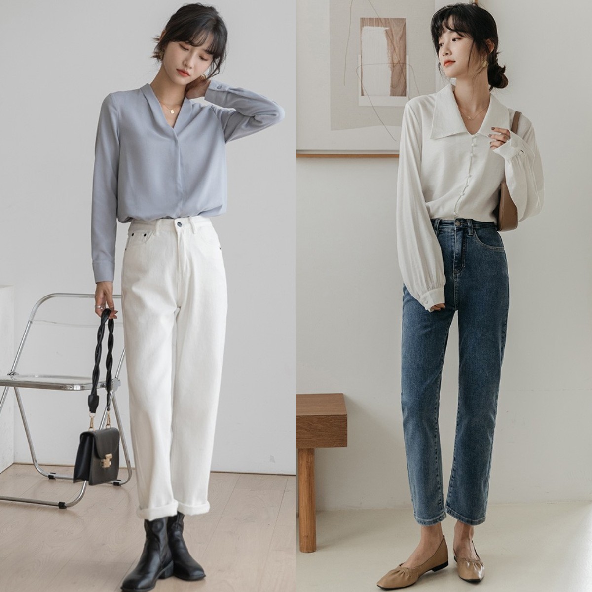 干练利落的衬衫和休闲随性的牛仔裤搭配在一起也毫无违和感。但由于牛仔裤本身比较硬朗,所以想要打造温柔知性风的话,衬衫要选择垂坠感强的雪纺或者真丝面料,用于中和牛仔裤的硬挺,增加造型的柔和气息。