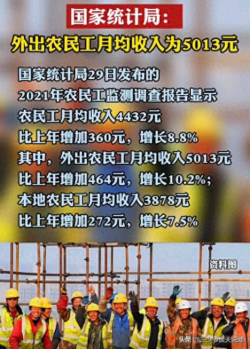 4月29日, 国家统计局发布了《2021年农民工监测调查报告》,显示,农民工月均收入4432元,比上年增加360元,增长8.8%。其中,外出农民工月均收入5013元,比上年增加464元,增长10.2%;本地农民工月均收入3878元,比上年增加272元,增长7.5%。