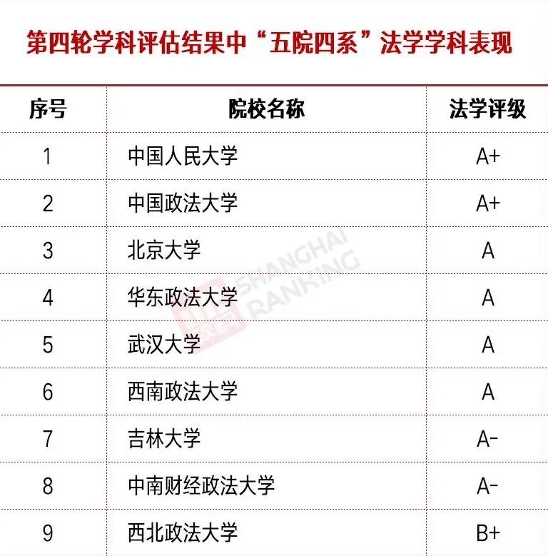 在教育部第四轮法学学科评估当中,五院四系表现亮眼,其中人民大学和中国政法大学取得了A+的好成绩;在教育部第五轮学科评估中,五院四系均取得了不俗的成绩,其法学学科均为A。