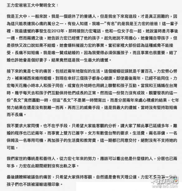 我是王大中,一般來說,我是一個退休了的普通人,但是我坐下來寫這段,才是真正困難的,因為這只能表達我心痛的萬分之一, 有些人知道,我唯一”有名” 的是我是王力宏的爸爸!這一輩子裡,我最遺憾的事發生在2013年,那時接到力宏電話,他和一位女子在一起,她說當時是月事後一遇,然而兩遇之後,她告訴力宏已經懷了他的孩子。起先她說不用擔心,她會獨自帶孩子,但是很快又改口說如果不結婚,她會爆料摧毁力宏的事業。當初家裡大部份認為這種威脅不能接受,長痛不如短痛,我是唯一贊成結婚的,因為我覺得必須保護孩子,而且事業也很重要,結了婚也許她會是個好妻子,結果竟然這是我一生最大的遗憾。