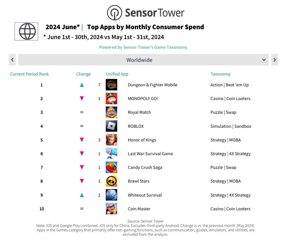 由腾讯发行的国服版本《地下城与勇士:起源》,在 2024 年 5 月登陆中国市场,并在 6 月吸金近 2.51 亿美元(合约人民币 18 亿元),成为本期收入最高的手游。