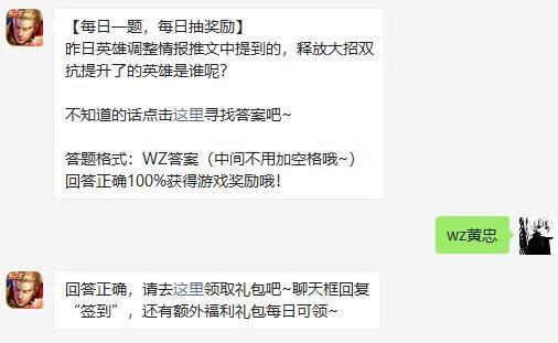 王者荣耀手游中,游戏中今天的问题是:昨日英雄调整情报推文中提到的,释放大招双抗提升了的英雄是谁呢?下面小小编小编为大家带来正确的答案分享,还不知道答案的小伙伴快随小小编小编一起来看看吧!希望可以帮助到大家!