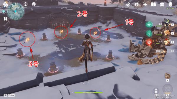 第一层解锁完成后,下面是第二层机关,这次是6个遗迹之烛和3个仙灵,3个仙灵触发后均为顺时针旋转,经过的遗迹之烛会被短暂触发。那么可以看出,要想让6个遗迹之烛在某一时刻同时亮起,关键就在于要使这3个仙灵在移动时等距且平分整个圆的周长。这里给仙灵编号,方便与后面的配图结合查看。