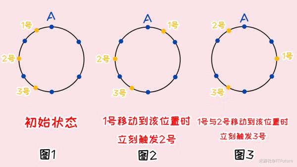 那么上述条件就变成了让3个仙灵移动时,两两之间保持2d的距离,即可解锁全部遗迹之烛。结合下图说明机关解锁流程: