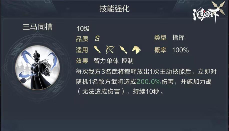 大军师的搭配思路和司马曹非常相似,都是以司马懿为核心输出点,依靠三马同槽的技能特点强化队伍输出。