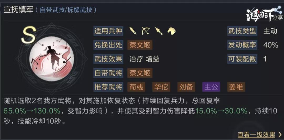 2号武技推荐宣抚镇军,之所以选宣抚镇军作为恢复武技,主要看重兵力回复率和CD。目前主公间的交战主流队伍依旧是武力队,智力减伤效果不够明显,但在打地时会有非常不错的发挥。