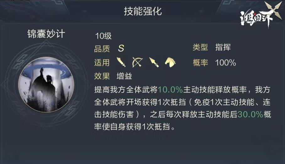 但大军师的坦度并不是依靠武技提升防御或减伤,而是通过抵挡效果直接免疫技能的伤害。三名武将自身的防御属性比较低,所以搭配合理的主动技能可以最大化发挥锦囊妙计的效果来保护己方。