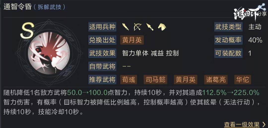 1号武技推荐通智令昏,该武技可随机降低一名敌方武将的智力并造成较高的单体伤害,可以根据降智比例提高眩晕的几率。在等级提升到33级后,司马懿的攻速将提升为队伍第一,即可优先打出降智状态,提高我方后续智力伤害。