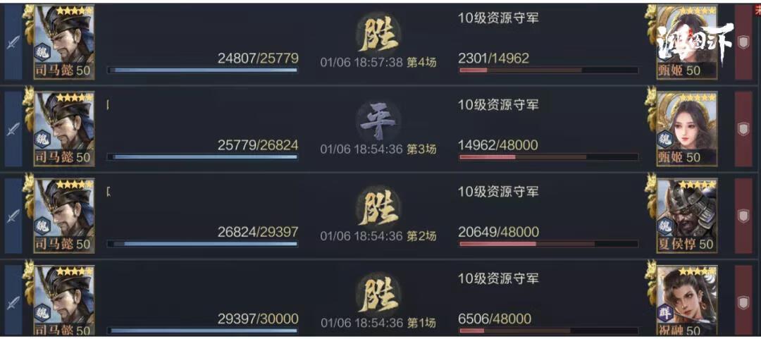 大军师队比其他法师队适用性更强,不仅在主公间的交战中表现强力,打地也非常稳定。这里选用10级地作为测试,可以做到1穿3,算上回城后的伤兵恢复,总战损仅在3000左右。
