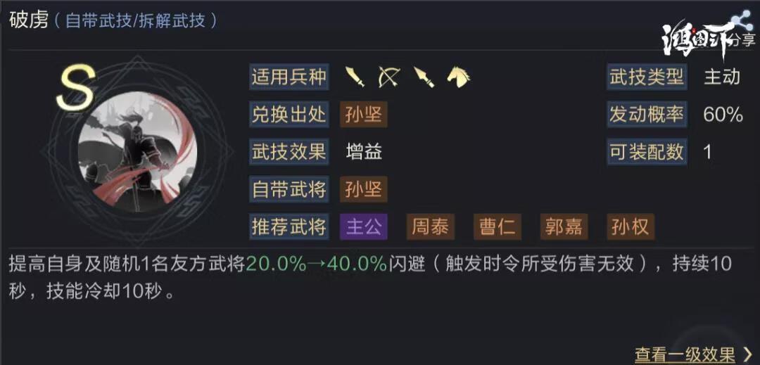 1号武技推荐破虏,能为自己和一名队友提供40%的闪避。该武技发动率高,CD短,在诸葛亮的加成下发动率能达到70%。相比一些减伤类或增防类武技,破虏能够使周瑜和队友受到的伤害大幅降低,同时能触发三马同槽效果。