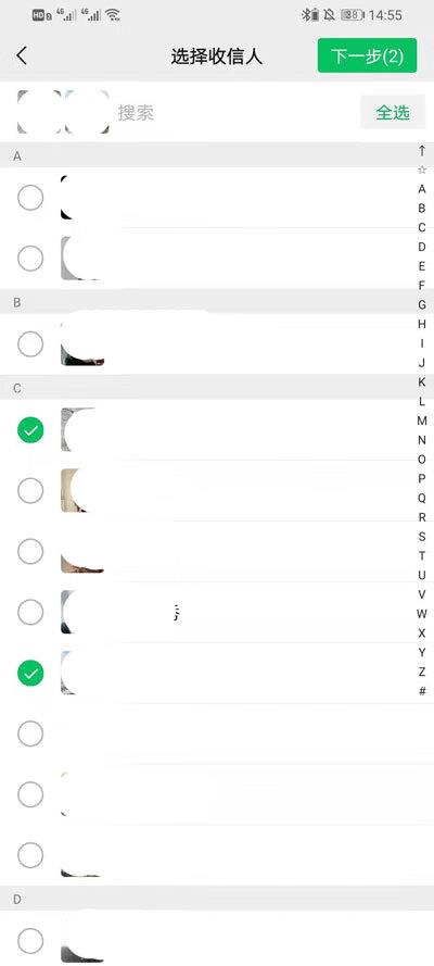 4、在选择人的界面中,我们只需要点击每个人的微信就可以选中群发,点击选中想要群发的好友后,点击右上角的【下一步】;
