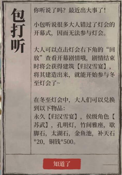 大人可以点击灯会右下角的“回放”查看开幕剧情哦,剧情结束时将会获得建筑[归汉雪宴],将其建造出来,就能开始参与冬至灯会了。