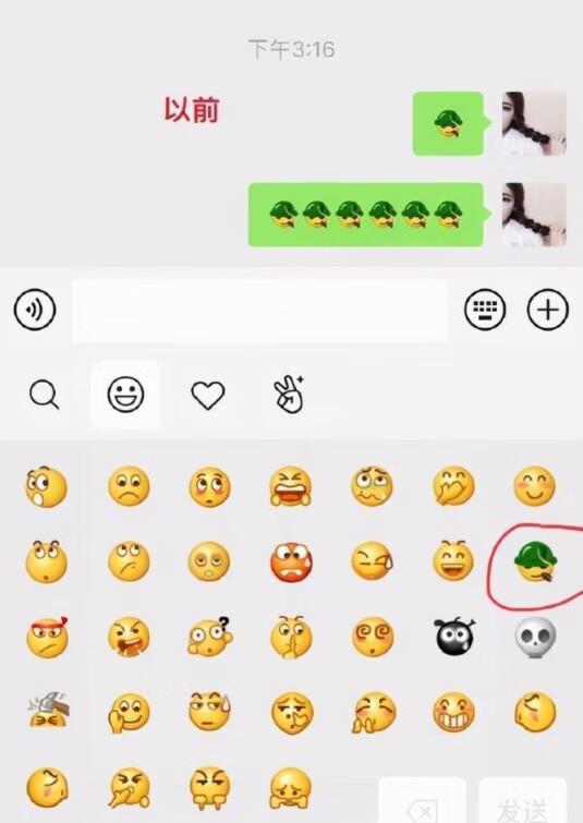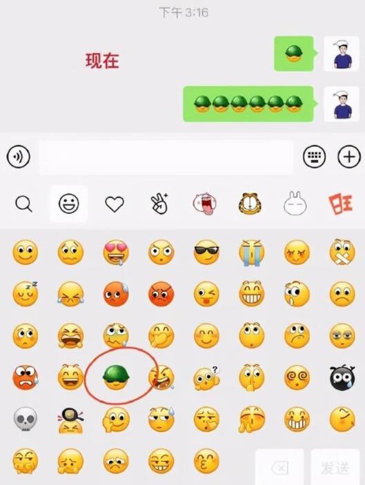 经过云端更新,微信自带的表情包面板里,代表“悠闲的”绿帽小黄人,之前嘴里叼着一根烟,而现在这根烟不见了。变成了嘴角上扬,酷酷一笑。