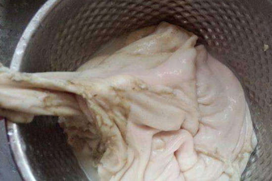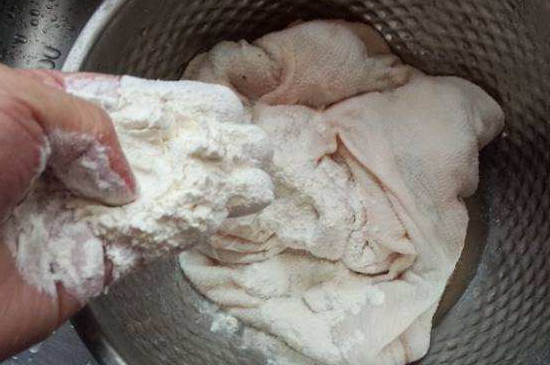 将食盐和醋洒在羊肚上面搓洗,以此来去除羊肚上的其他物质和黏液,用清水清洗干净之后再加入面粉搓洗,这样就可以去除羊肚上的油脂,搓洗完之后还是继续用清水冲洗。