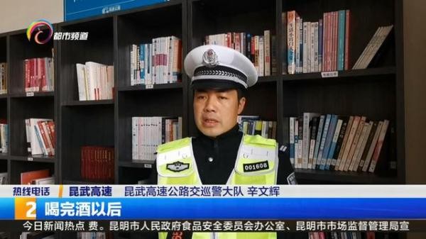 昆武高速公路交巡警大队 辛文辉:“ 这里要提醒广大驾驶员朋友,喝完酒十六个小时以后才能驾驶机动车,对饮酒后驾驶机动车的处罚,就是两千元的罚款、记十二分、扣证六个月。”