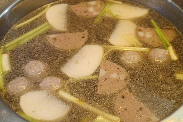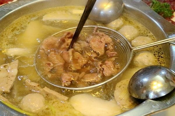 牛骨、牛腩精心熬制的汤底,再加牛肉丸、牛肉饼、白萝卜、芹菜等,即成福合埕特色汤底(38元/份)。