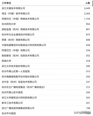 在工作单位的人才数量排序中,阿里系遥遥领先,前三名的分别是天猫、淘宝和阿里巴巴。