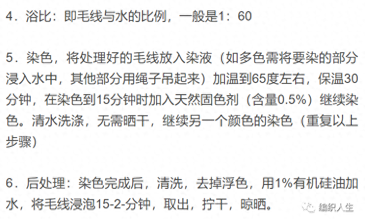 三.助剂常用的有,前处理剂(用于毛坯线的练白和去杂质),媒染剂(明矾,铁媒粉,碱,小苏打,大苏打,石灰粉,豆浆等)有机硅油(用于后处理的柔软)四.染色步骤