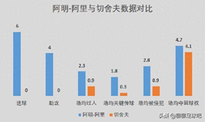 上图为阿明-阿里与切舍夫的部分数据对比,切舍夫在此更多出现在中前卫的位置上,不过显然他与阿明-阿里之间的数据是相差非常大的,从上图可以发现,阿明-阿里不仅进球助攻多,创造机会、甚至防守夺回球权的次数也要优于切舍夫,双方巨大的实力差距,让切舍夫无法弥补阿明-阿里缺阵造成的影响。