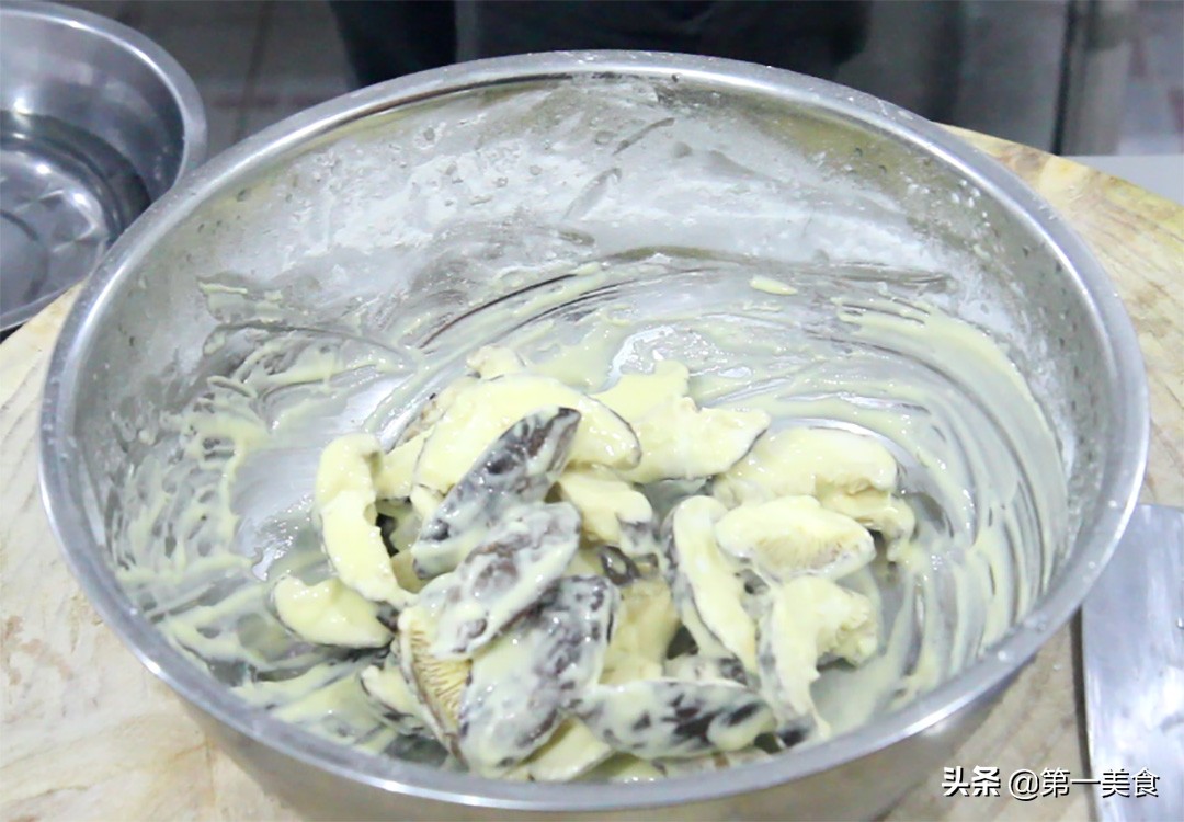 准备一个盆,打入一个鸡蛋,加入两大勺淀粉,三大勺面粉,加一点清水搅拌成糊,再加一小勺植物油搅拌均匀,倒入香菇片均匀裹上面糊。