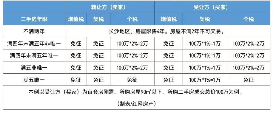 根据长沙市住宅类二手房交易政策可知,“满五唯一”的个人转让方,享有税费优惠政策,免征增值税、印花税、个税,不征土地增值税与契税。受让方只需根据本家庭所拥有的房产数量交纳税费。若受让方为单位,则需以单位规模交纳相应印花税与4%的契税。