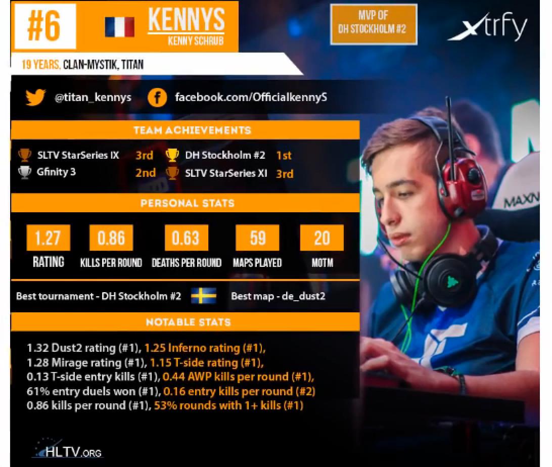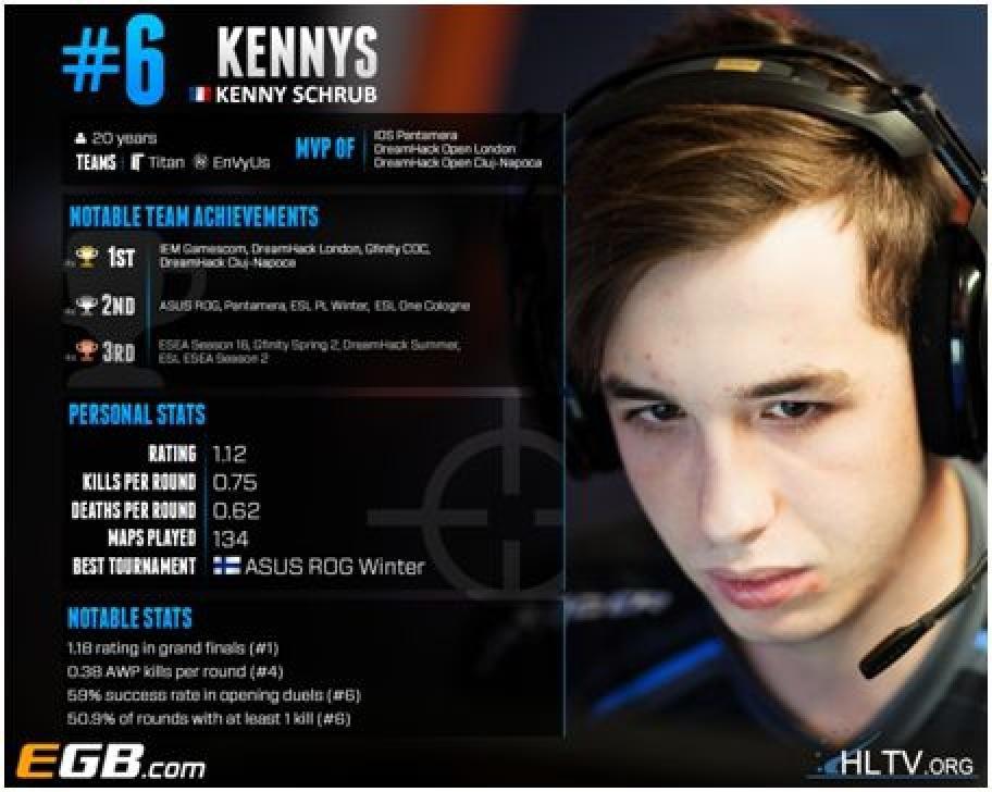 他最终在DreamHack公开赛克鲁日-纳波卡,今年的第三个major赛事中证明了自己的价值。为EnVyUs夺冠立下汗马功劳,尤其是对阵G2的半决赛,1.21的rating和+21kd,全队最佳;决赛对阵Na`Vi更是疯狂的1.48 rating和+17kd;整个赛事kenny的1.23 rating全队最佳,排在了GuardiaN和Snax后,在所有队员中排在第3。而他在这些数据中:总击杀 (206), 最多残局胜利(6), 总AWP最多击杀 (101) 和开局首杀胜利数 (31),拿到了第一。其后的一些小比赛,EnVyus似乎不太感兴趣,表现差强人意,而最后的ESL ESEA Pro League他们也在半决赛输给NaVi,Kenny以1.03rating和+14kd,位列队内第三。而15年的起起伏伏状态让Kennys只是在榜单中保持第六。