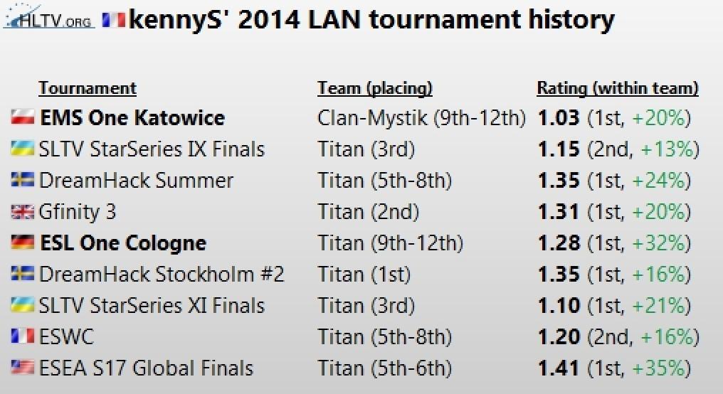 经过一系列的换队,Kennys来到了当时法国cs数一数二的队伍Titan。而这一年则正是KennyS放开手脚的一年,他的表现达到了极致。Titan在这一年都没有拿到什么成绩,唯一的一次冠军也只是DreamHack Stockholm Invitational II。但是KennyS几乎拿到了平均1.3的rating,保持着极高的水准。而在这一年Kenny的表现也为他赢得了许多人气。