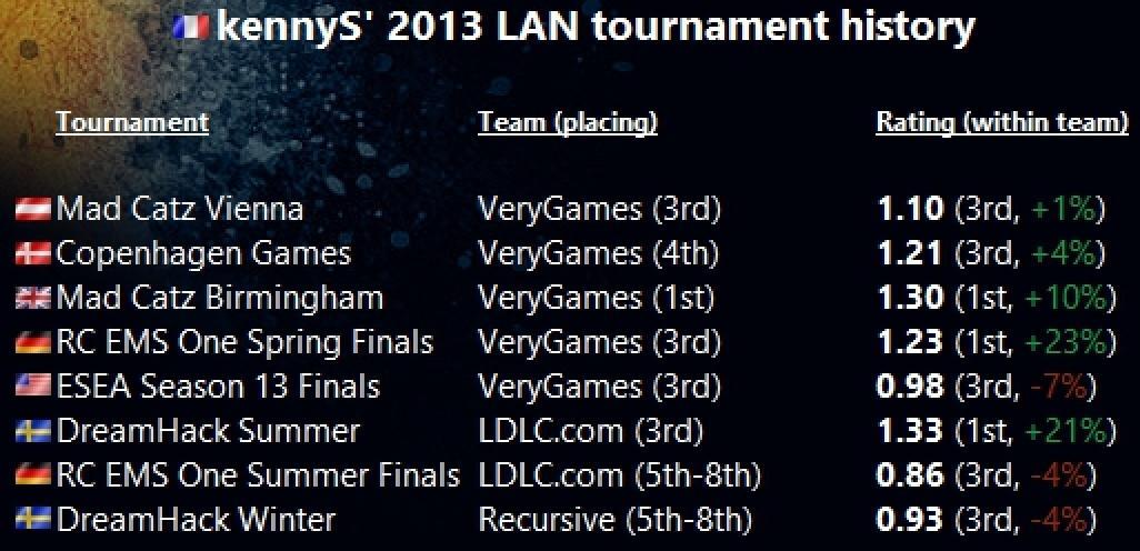 离开了自己的老东家,Kenny陷入了迷茫,他不断的更换队伍,不断寻找新的战队。在剩下的时间里,他分别去了LDLC、 WARMAKER,、WE GOT GAME以及Recursive。尽管如此,KennyS早期在VG的状态还是十分抢眼,这也为他赢得了HLTV 2013年TOP20选手的第12名。