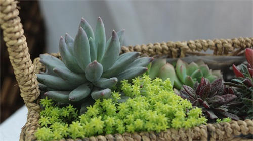 我选择的盆器是草编盆,里面有一层塑料薄膜,在种植之前已经扎破了几个洞,所以不用担心透水透气问题。然后做了一个对比,圆盆里种的相对来说比较密,而且用的都是花月夜、冬美人这种比较叶片肥厚的品种,铺面也是星乙女和佛甲草,看起来都比较肥肥的,所以刚种完效果看起来就不错,有一种肉肉挤在一起的感觉;而长盆里种的相对来说比较稀,选择的是蓝黛莲、花簪和万年草,所以刚种完看起来稀稀拉拉的不好看,而且空空的。