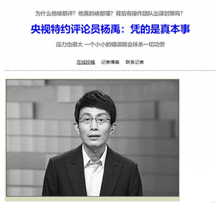 这不是我起的题目,这是2011年4月26日河南日报社大河网的报道。近日,央视特约评论员杨禹火了,火的原因是评论员自己被评论了。