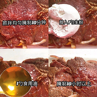 3、抓拌均匀腌制10分钟左右,然后放入1勺生粉,1勺食用油抓拌均匀,腌制10小时以上