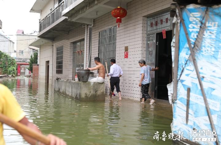一路上,有村民站在齐腰深的洪水中清洗房屋的外墙,有村民在为皮划艇充气,准备出行,一位村民边刷地边说,“我这个楼变成了河景楼喽。”