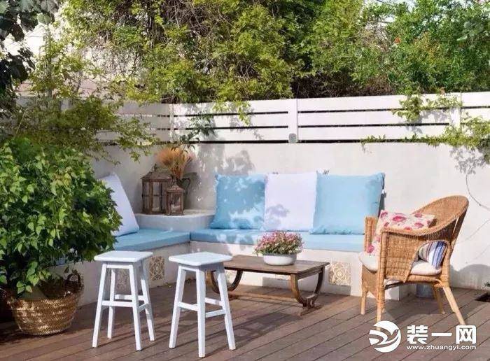 现在新型地砖也占据大部分市场,它的外表具有防液体渗透的排水表面结构,雨水及污垢可以迅速消退,就算是多雨的季节,露台地面也能够干爽整洁,卫生和装饰效果良好。而且新型地砖符合环保要求,不会对人体有害。地中海式的装修露台选用新型地砖陪白色家具,素净美好。往往大面积的露台选择地砖的可能性大,顶楼的露台视野更好,空气更清新,白色中添加一抹绿更加显得生机勃勃。