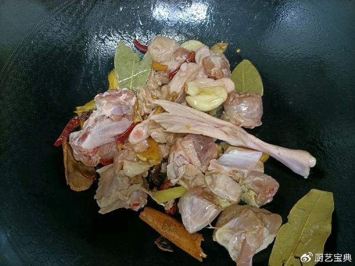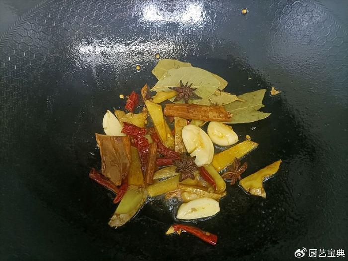 用油锅烧热,加入白砂糖。随着温度升高,糖开始起泡,我们的锅中充满了诱人的焦糖香气。然后,加入生姜、大蒜、八角、桂皮、香叶和干辣椒,这些香料的交织在一起,令人垂涎欲滴。